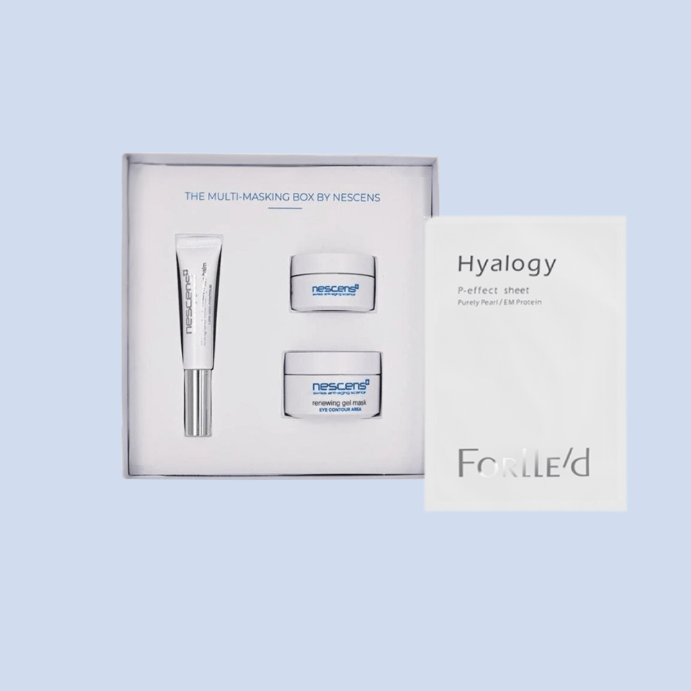 Unlock a complete masking experience with this exclusive $600 gift set. The Nescens Multi Masking Set delivers targeted rejuvenation across three zones: a renewing gel mask for the delicate eye contour, a lifting and volumizing balm for lips and facial contours, and a bio-identical restoring mask for comprehensive facial renewal. Paired with Forlle'd's Hyalogy P-Effect Sheet Mask—an intensive hydration treatment—this curated collection addresses multiple skin needs in one luxurious ritual, revealing refined texture, restored volume, and luminous vitality.
